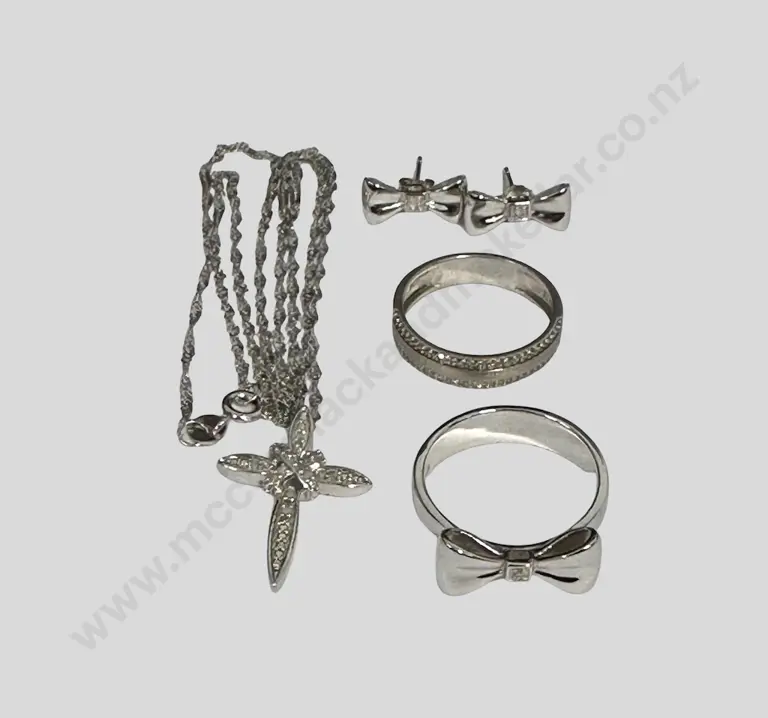 Sterling Silver & Diamond Cross Necklace, Sterling Silver Bow Ring with Matching Earrings & Sterling Silver Ring TW11gms Estimate: $100 - $200