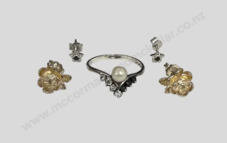 Sterling Silver Pearl Ring and Two Pairs of Silver Earrings TW5.6gms Estimate: $70 - $150
