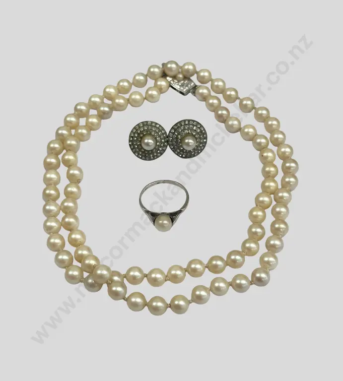 Single Strand set of Pearls, L58cm, Sterling Silver and Pearl Ring and Pearl and Marcasite Earrings