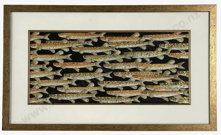 Patricia Payne - Winter Solstice, Whitebait, oil and gold leaf on paper, 215x480mm