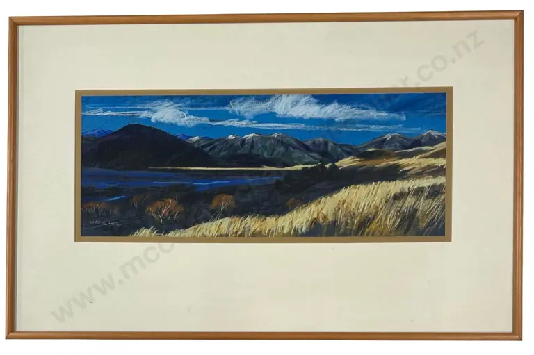 Wayne Mcphail - Evening Shadows Waimakariri, Main Highway Cass, 1999, pastel on paper, 225x590mm