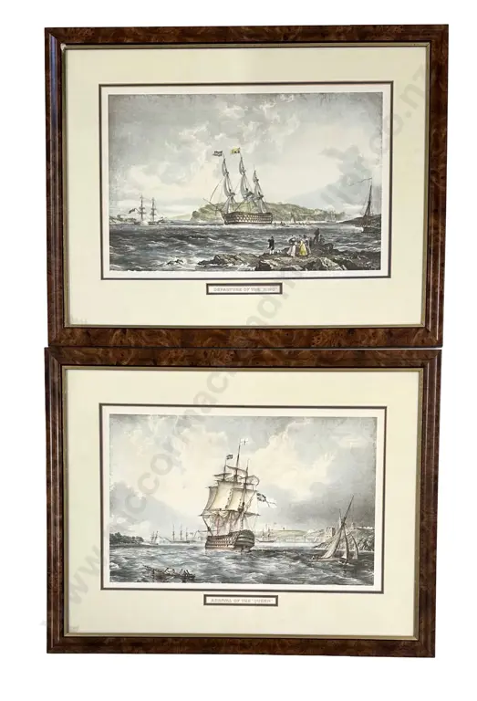 The Departure of the King and Arrival of the Queen Maritime Prints in Burr Walnut Frames 345x525mm