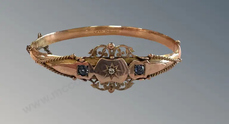 9ct Gold Ruby Sapphire and Diamond Bangle, TW52gms Estimate: $3,600 - $5,000