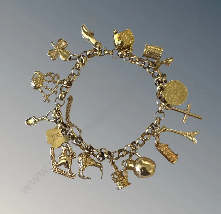 9ct Gold Charm Bracelet with 14 Charms, 18ct (1) 14ct (2) 9ct (10) TW23.5gms Estimate: $1,500 - $2,500