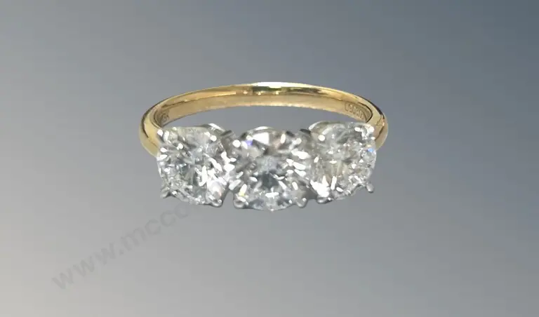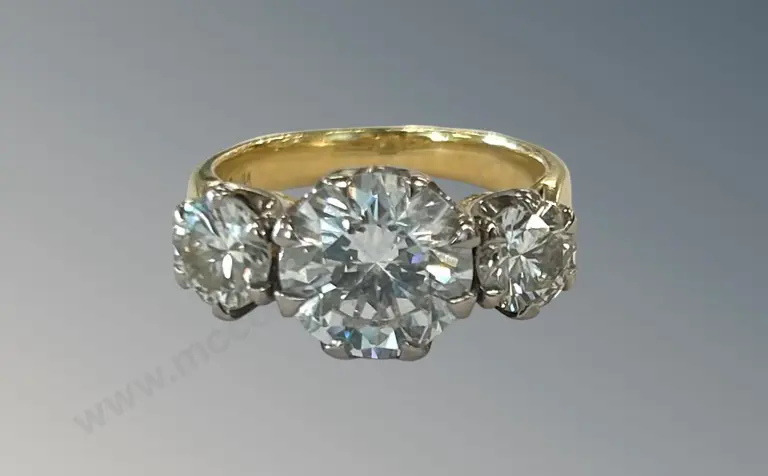 18ct Yellow and White Gold 3 Stone Diamond Ring, 4.4ct, Clarity S12, Size L, TW6.7gms, Valuation $94000 Estimate: $23,000 - $30,000