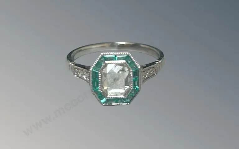 18ct White Gold Octagon Rose Cut Diamond and Emerald Cluster Ring, Diamond .78ct, Size P, TW3.46gms, Valuation $8950 Estimate: $3,500 - $5,500