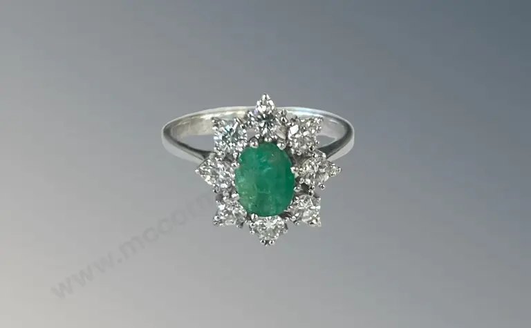 18ct White Gold Emerald and Diamond Oval Cluster Ring, Emerald .96ct, Size N, TW5.17gms, Valuation $6155 Estimate: $1,500 - $2,500