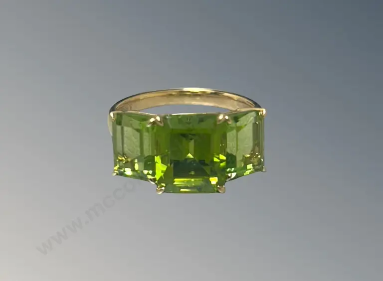 18ct Gold 3 Stone Peridot Ring, 3.93ct, Size P, TW5.65gms, Valuation $7000 Estimate: $2,400 - $4,000