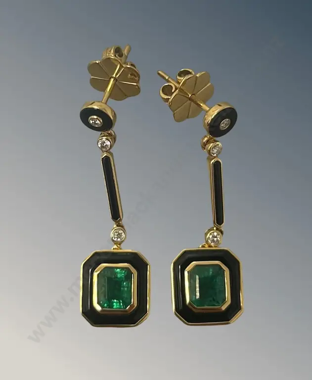 Pair of 18ct Gold Emerald, Onyx and Diamond Drop Earrings, Emeralds 1.64ct, TW6.52gms, Valuation $9800 Estimate: $3,300 - $5,000