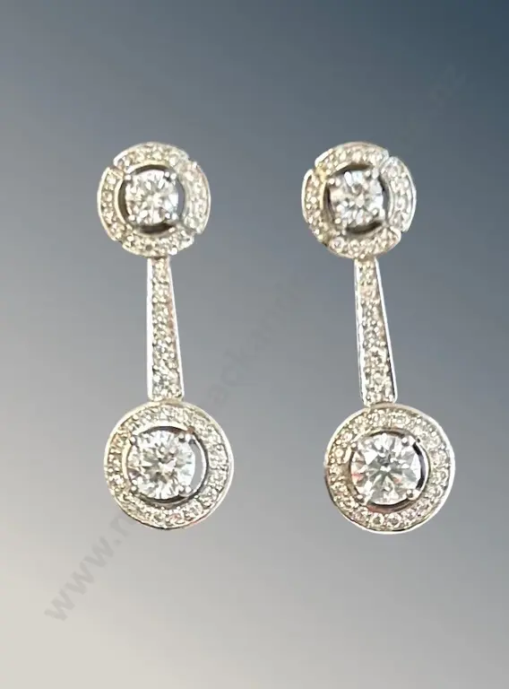Pair of Platinum and Diamond Halo Cluster Drop Earrings, TGW2.00ct, Valuation $15900 Estimate: $4,000 - $6,000