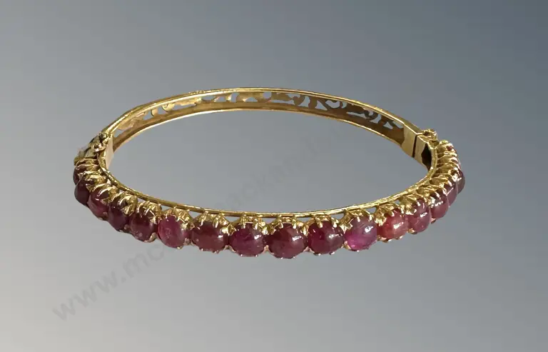 18ct Gold and Ruby Hinged Oval Snap Bangle, TW12.09gms, Valuation $4850 Estimate: $1,800 - $2,500