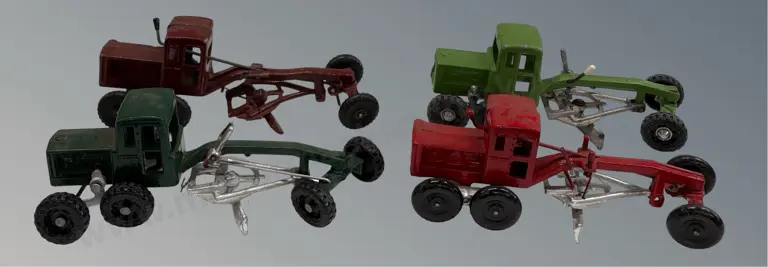 Four Fun Ho! No. 801 Front End Loaders, Three No. 806 Trailers, some missing steering wheels (repainted)