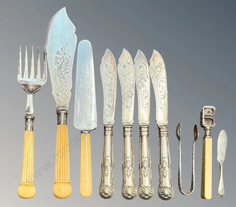 Assorted Bone handled Silver Plate Fish Knives, Servers, Tongs, Knife Sharpener etc