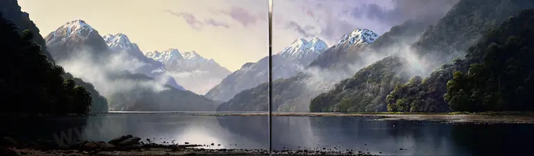 Tim Wilson - On the Makarora River, diptych 2007, oil on beige linen, 300x1000mm