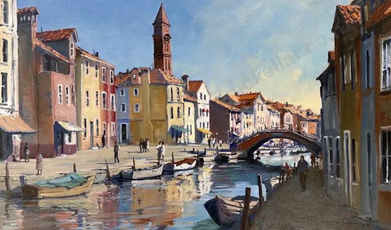 W F Moore - Canal Scene, Burano, Italy, oil on canvas, 590x990mm Estimate: $1,500 - $3,000