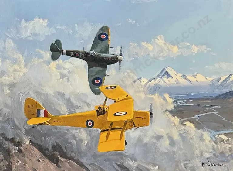 Peter Beadle - Spitfire and Tiger Moth over Mount Cook, oil on board, 445x595mm
