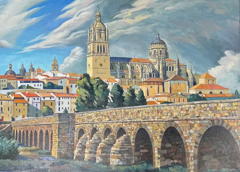Don McAra - Roman Bridge and Cathedral Towers, Salamanca, Spain, oil on board, 730x1020mm