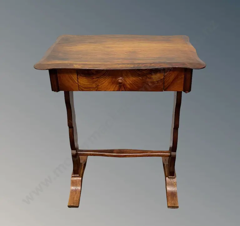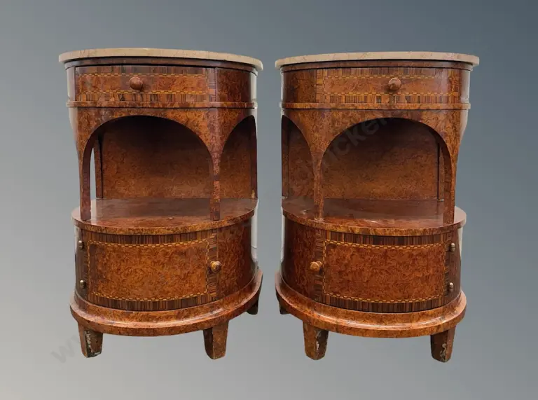 Pair of Burr Maple Half Round Bedside Tables with Marble Tops – Biedermeier revival, c.1920's L59xH83xD43cm