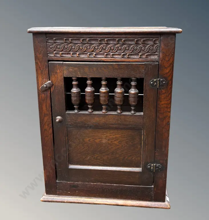 Oak Carved Single Door Wall Cupboard with Turned Finials L45xH59xD26cm