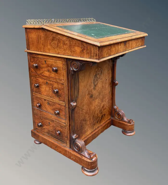 Walnut with Fruitwood Inlay Davenport, Four Drawers, Brass Fretwork and Fitted Interior L53xH83xD55cm