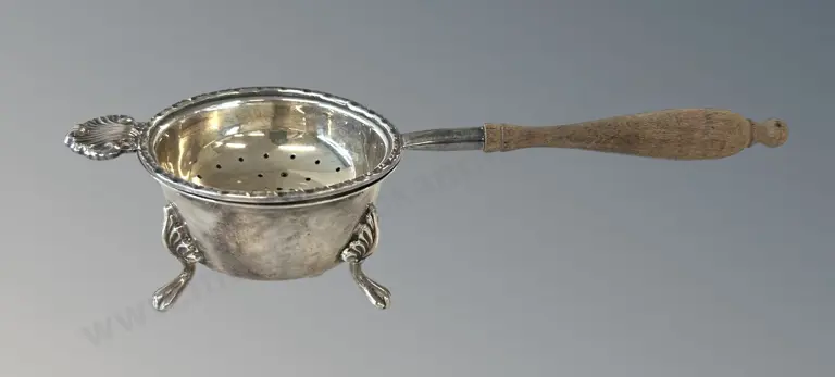 Sterling Silver Tea Strainer with Wooden Handle and Stand, TW93gms