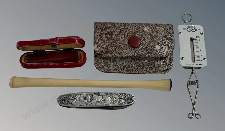Postal Scales Swiss Pocket Knife with Embossed Lion, Leather Cased and Bakelite Cigarette Holders