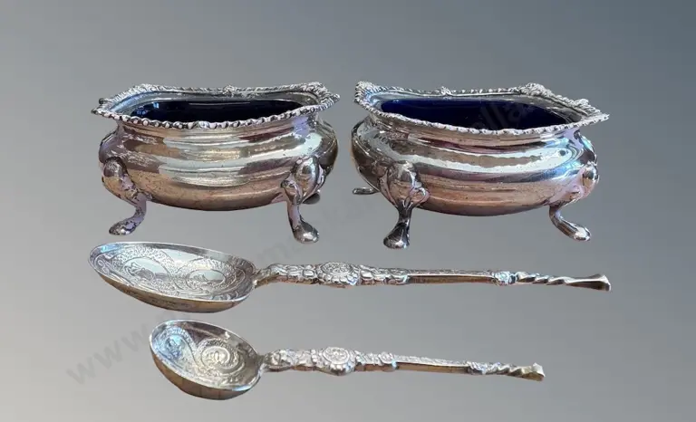 Pair of Sterling Silver Footed Open Salts with Blue Liners and Two Spoons, TW74gms (without liners)