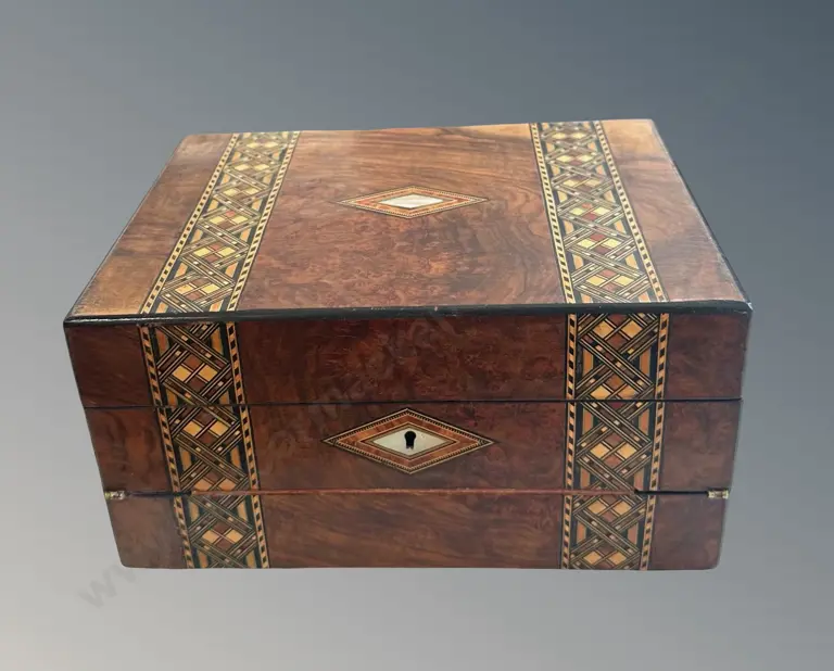 Burr Walnut with Marquetry Inlay and MOP, Trinket/Writing Box with key, L29xW21xH15.5m