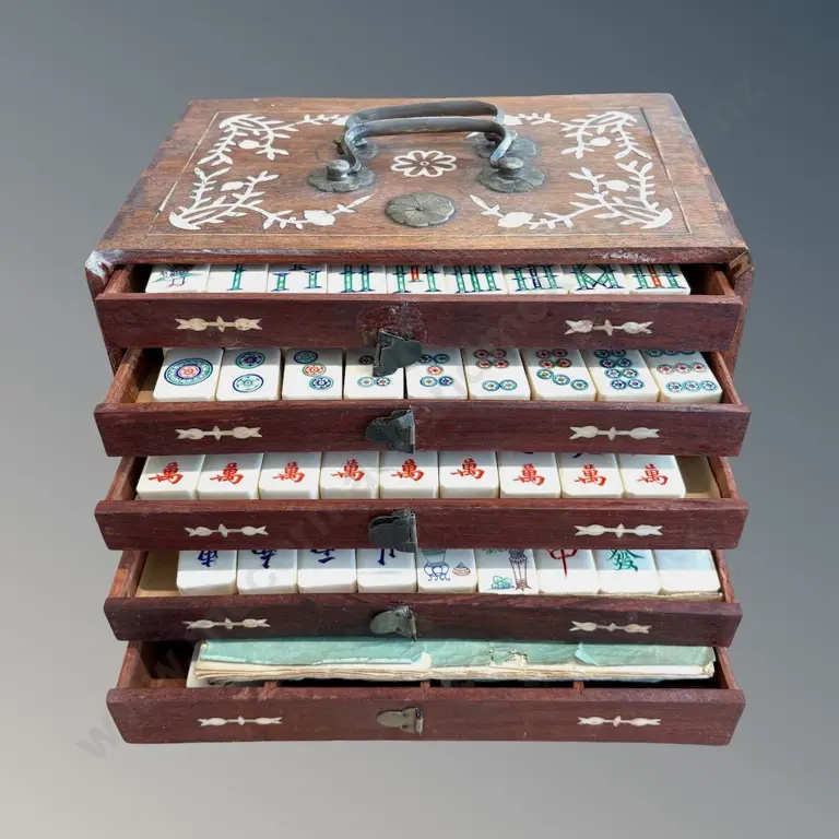 Oak Boxed Mahjong Set with Brass and Bone Inlay, AF