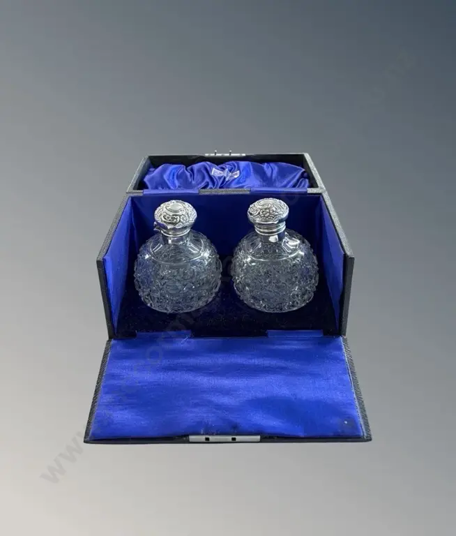 Boxed Pair of Crystal Bottles with Sterling Silver Tops, 1 hinge AF
