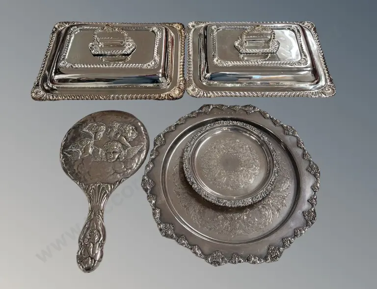 Silver Hand Mirror with Embossed Angels, Entree Dishes (2), Old Sheffield Tray with Grape Border & Smaller Tray